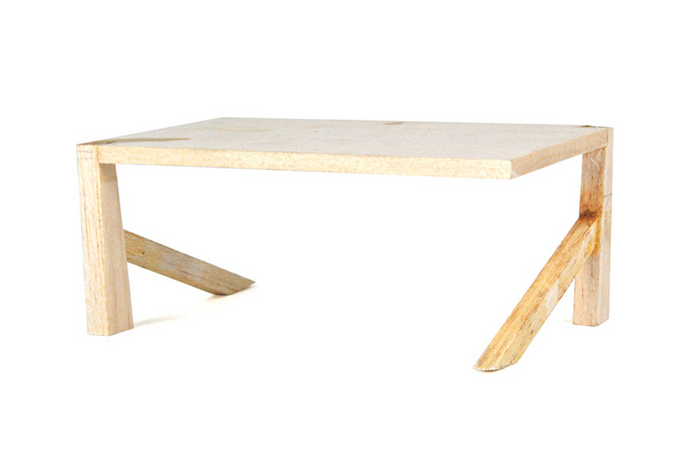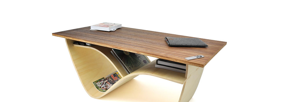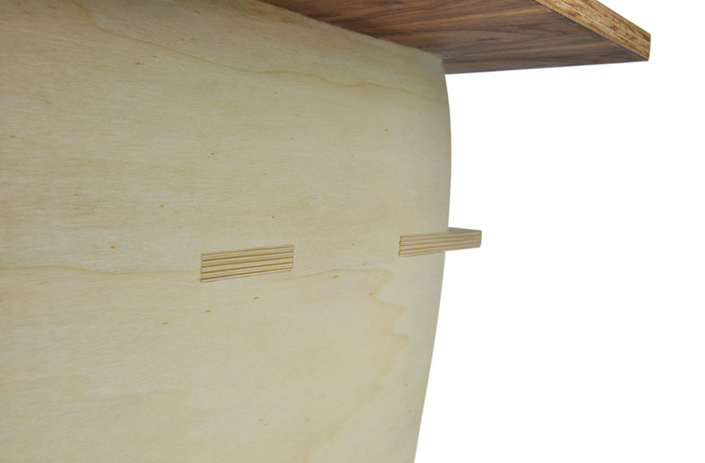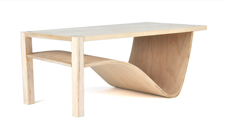 The final design evokes both mid-century modern and the form of the Audi headlight. The leg and additional shelf are crafted out of the same bendable plywood to reduce wasted materials. The legs are also connected with box joints to ensure the table is sturdy and avoids the use of hardware. Furthermore, this design creates unique and varied storage options for the user. Finally, the tabletop is made of walnut plywood and the entire table is finished with Danish oil.